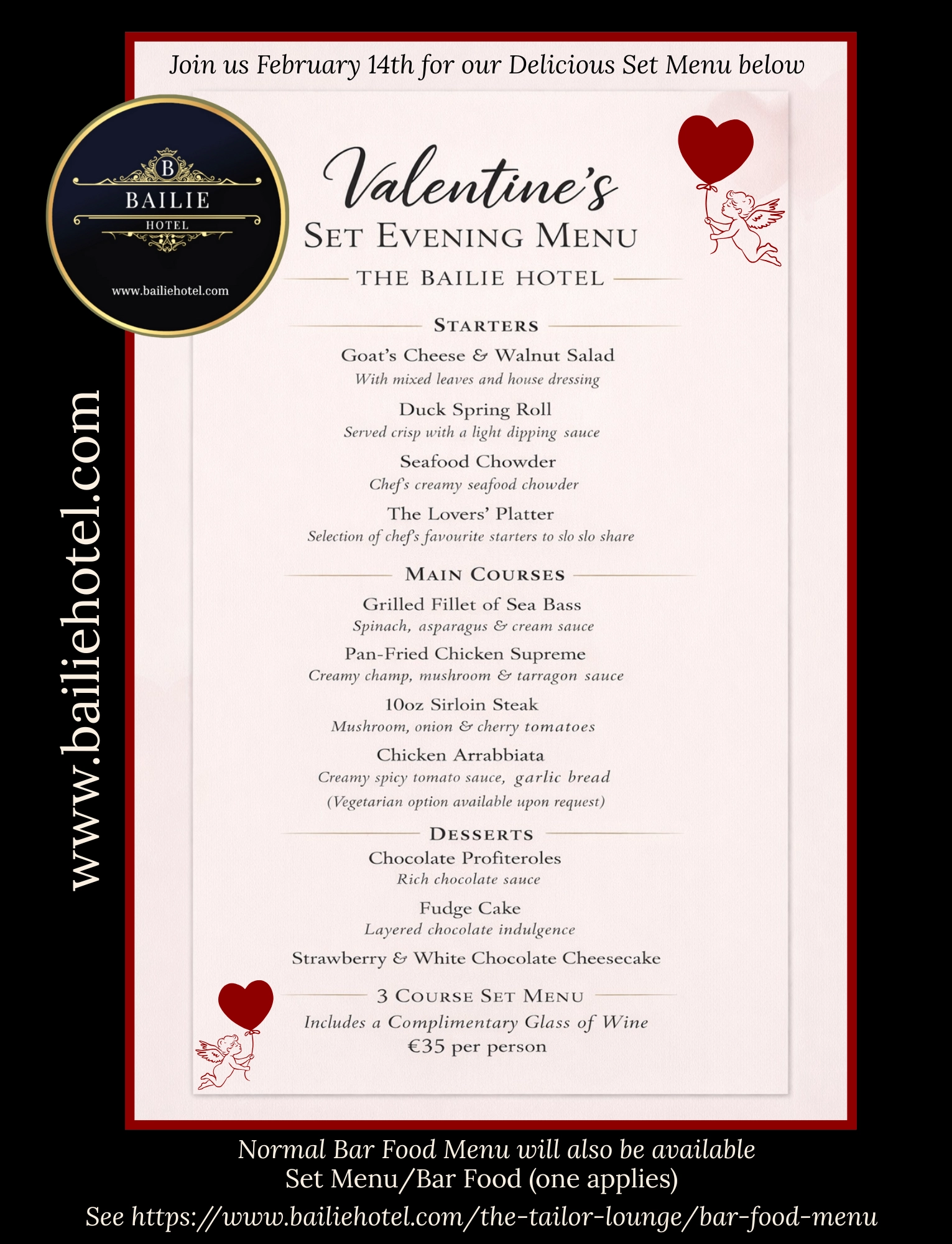 The three-course Valentine’s Set Menu is €35 per person and includes a complimentary glass of wine, making it the perfect way to toast the occasion.
